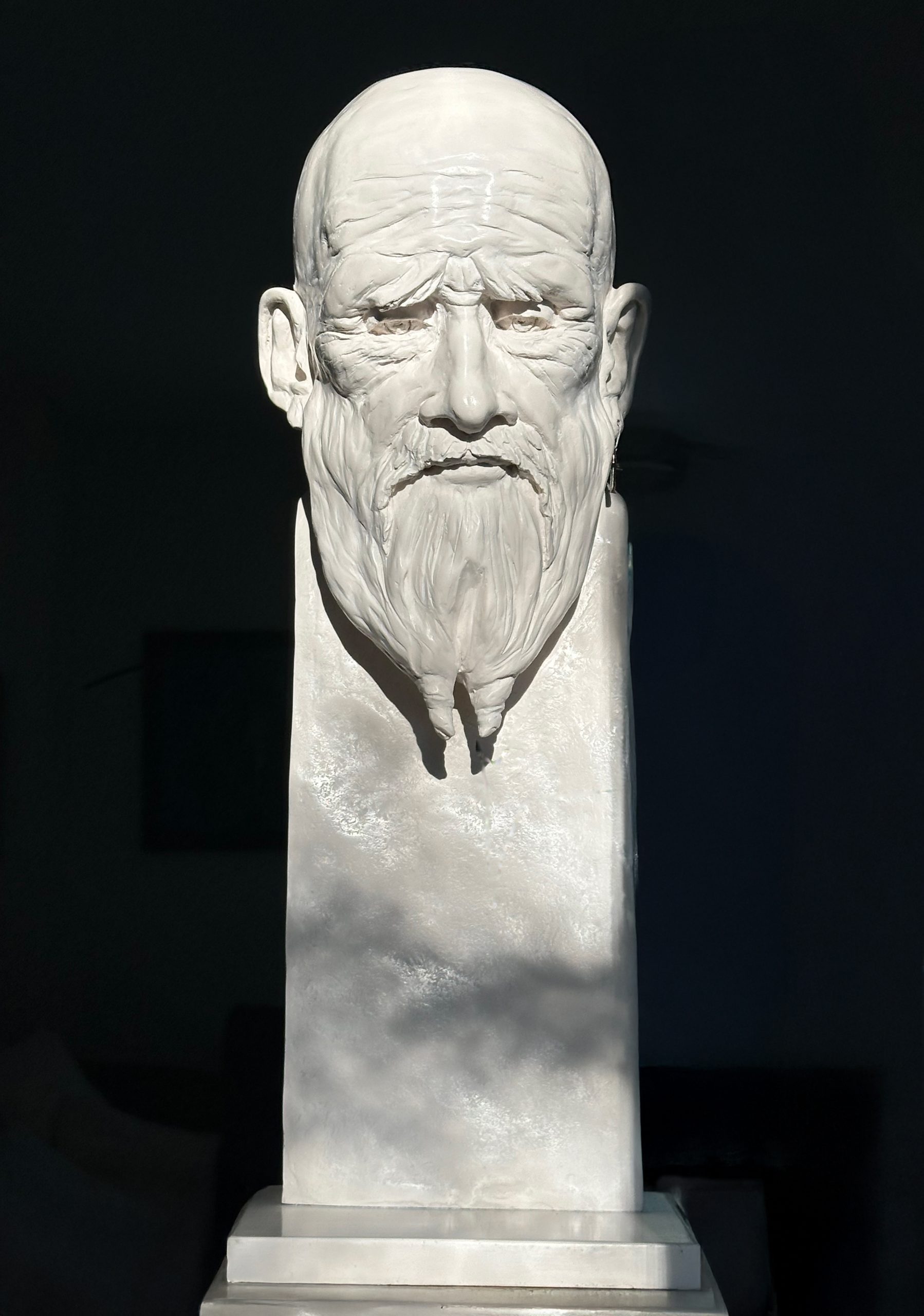 Dans cette sculpture, le visage d’un homme marqué par les ans nous livre une réflexion silencieuse sur la fragilité du temps.